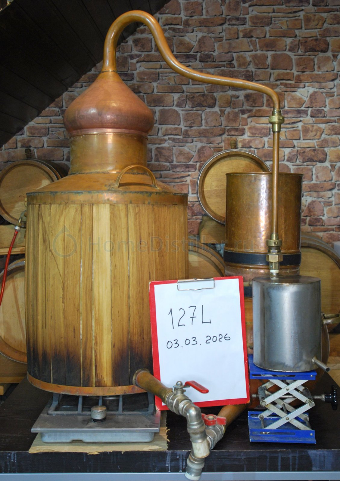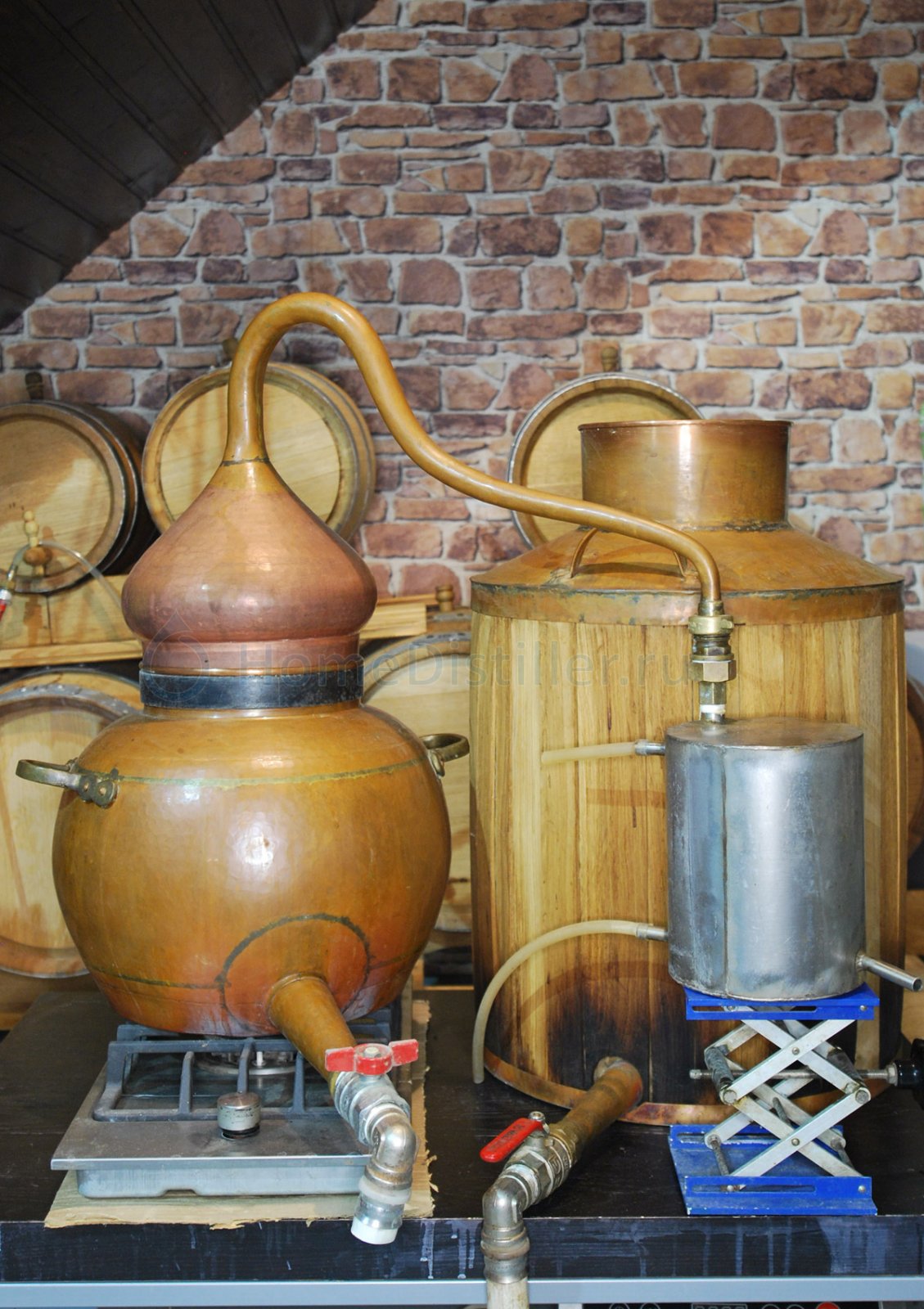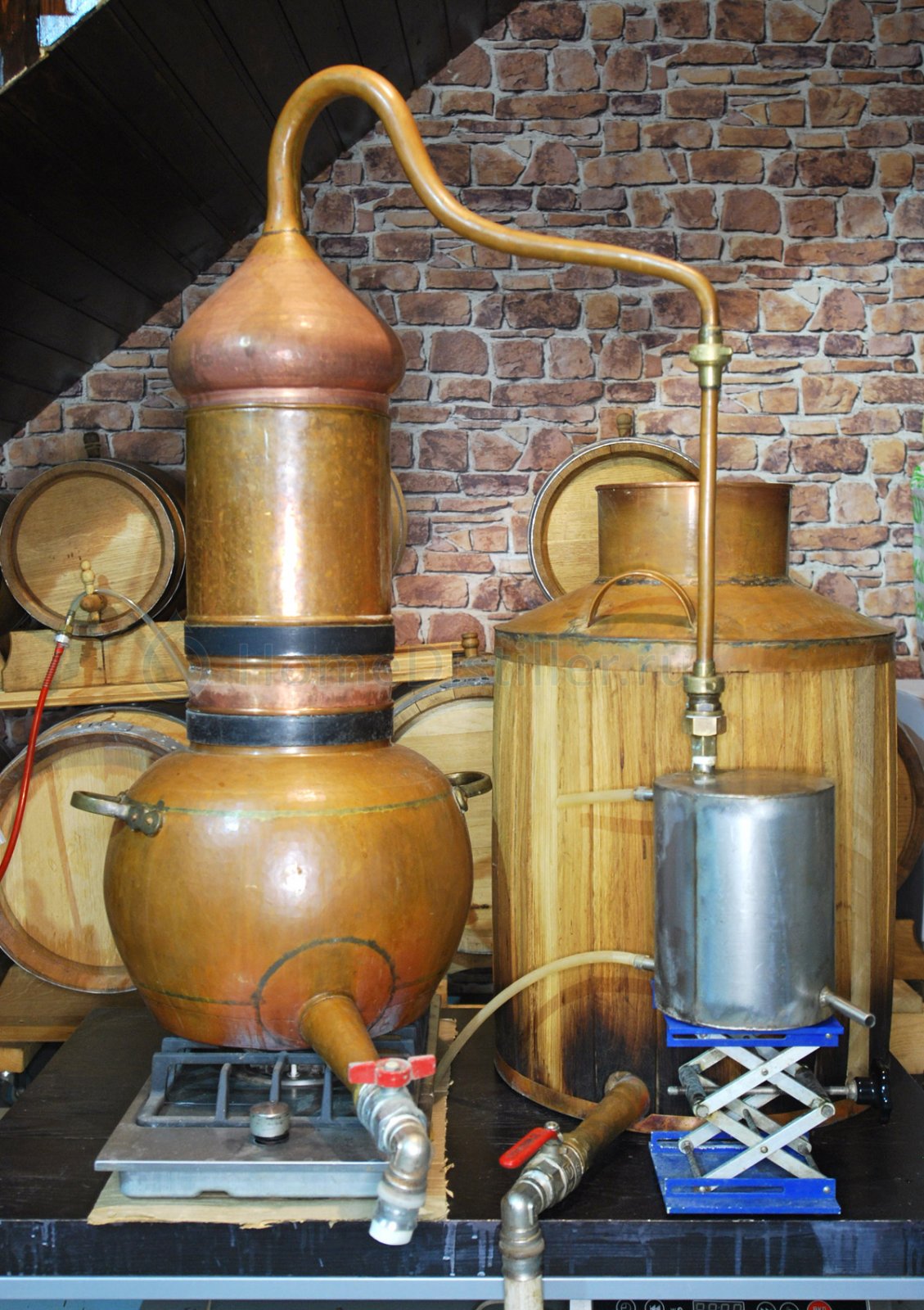 Барахолка » Оборудование » Комплекты » ДистилляцияКомплект медного оборудования предназначен для создания зерновых, солодовых и фруктовых дистиллятов по винокуренным технологиям существовавшим в России до середины XIX. Основным отличием от современных технологий является прямой (непосредственный) нагрев бражки, находящейся в контакте с медью, пламенем или топочными газами. Эффективность кубовой (прямоточной) перегонки без использования дефлегматоров и тарелочных колонн заметно ниже современных вариантов предлагаемых домашнему винокуру, однако использование прямого нагрева и простой перегонки позволят получить дистиллят имеющий более яркий органолептический профиль. Особенно явно это видно на примере хлебного вина приготовленного огневым и паровым (ПВК, острый пар) способом. Предлагаемый комплект оборудования подходит для приготовления дистиллятов из зерна, солода и фруктов, предназначенных для последующей длительной выдержки в дубовых бочках. Кроме того, используя, входящую в комплект колонку, можно создавать ароматные спирты практически из любого растительно сырья. В состав комплекта входит: 1.Бражный медный куб, объем 60 литров, имеющий оригинальную форму дна (обратный конус) позволяющую избежать прибора при перегонке зерновых бражек (по красной схеме). 2.Винный (спиртовой) медный кубик, объем 30 литров, аламбик с колонкой и шлемом, произведен в Португалии. 3.Холодильник из нержавеющей стали, змеевик, прочный корпус, 4.Газовая плита, двухконтурная горелка, мощность 4 КВт, производство Италия, оригинал, жиклер для природного газа. Оборудование Б/У, эксплуатировал более 12 лет, результатами доволен, вынужден продавать по причине смены места жительства. Покупателю в подарок видеокурс «Начальный курс винокурения», поддержка по сборке и настройки оборудования. Консультации по технологии приготовления хлебного вина и других дистиллятов на прямотоке. Возможен торг.