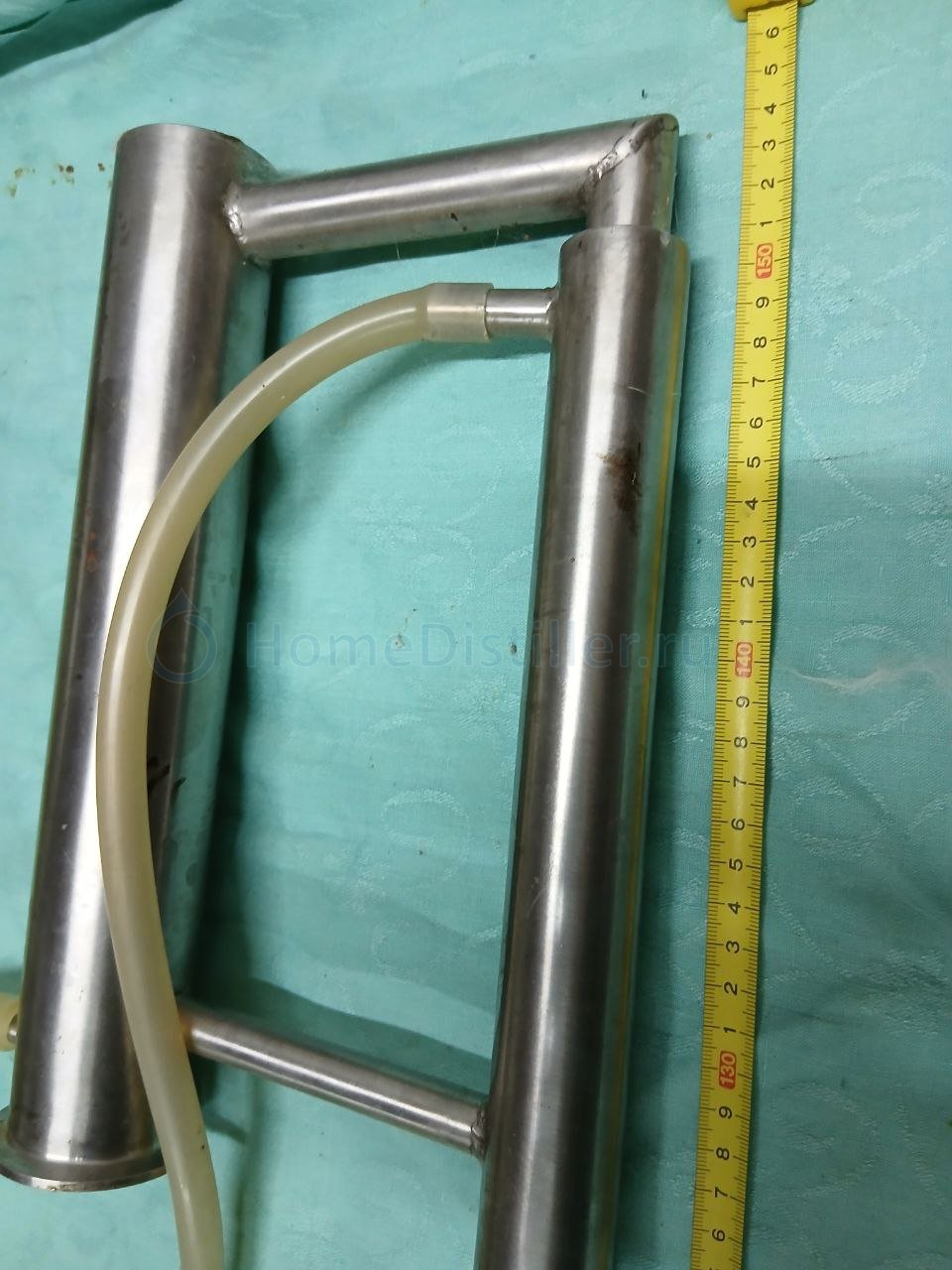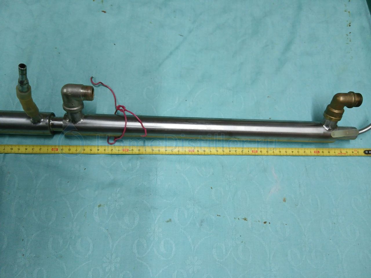 Барахолка » Оборудование » Комплекты » ДистилляцияНБК 2" самодельная, была сделана с учетом опыта работы на покупной НБК с форума СиВ. Чтобы утепление царги плотнее сидело и ниже были теплопотери подмотал под нее шерстяную пряжу. Большое количество мест контроля температуры позволяет точно держать режим. Длина основной царги 143см,добавочной 55см. 24 тарелки. На нее ставится добавочная царга 55см и предподогреватель с царгой высотой 30см с еще 5 тарелками. Итого максимальная высота при работе в режиме НБК 229см и работают 29 тарелок. Если добавочную царгу не ставить, то высота будет 173см и 24 тарелки. В наличии две шпильки с тарелками в сборе. Одна — для работы в режиме НБК, а вторая — в режиме ТК. В режиме ТК для получения более низкой крепости дистиллята часть тарелок можно снимать. На тарелках лежат шайбы — это для подбора оптимальной производительности НБК в зависимости от крепости и густоты браги или ароматной настойки. Например при работе с мучной брагой они снимаются. Также для обеспечения возможностей подбора есть еще два комплекта тарелок в запасе. Поскольку я был ограничен по подаваемой мощности 2,5кВт, то выше 20л/ч качественного отжатия барды не получал. Но и такой задачи не стояло. Имея запас по мощности можно меньше возиться с подбором сечений отверстий тарелок. Особенно хорошо себя НБК показала при приготовлении джина, анисовой, медовой, лимонной, хлебной и особенно яблочной водки. Дело в том, что при кубовой перегонке настойки яблочный вкус быстро переходит во вкус яблочного компота. В комплект НБК входят: Предподогреватель совмещенный с ДЭФом длиной 154мм. В том числе царгой длиной 30см для осаждения пены на верхней тарелке. Основная царга с обратным клапаном длиной 143см Добавочная царга длиной 55см Две основных шпильки с тарелками. Добавочная шпилька с 5 тарелками. Два комплекта тарелок в запасе.